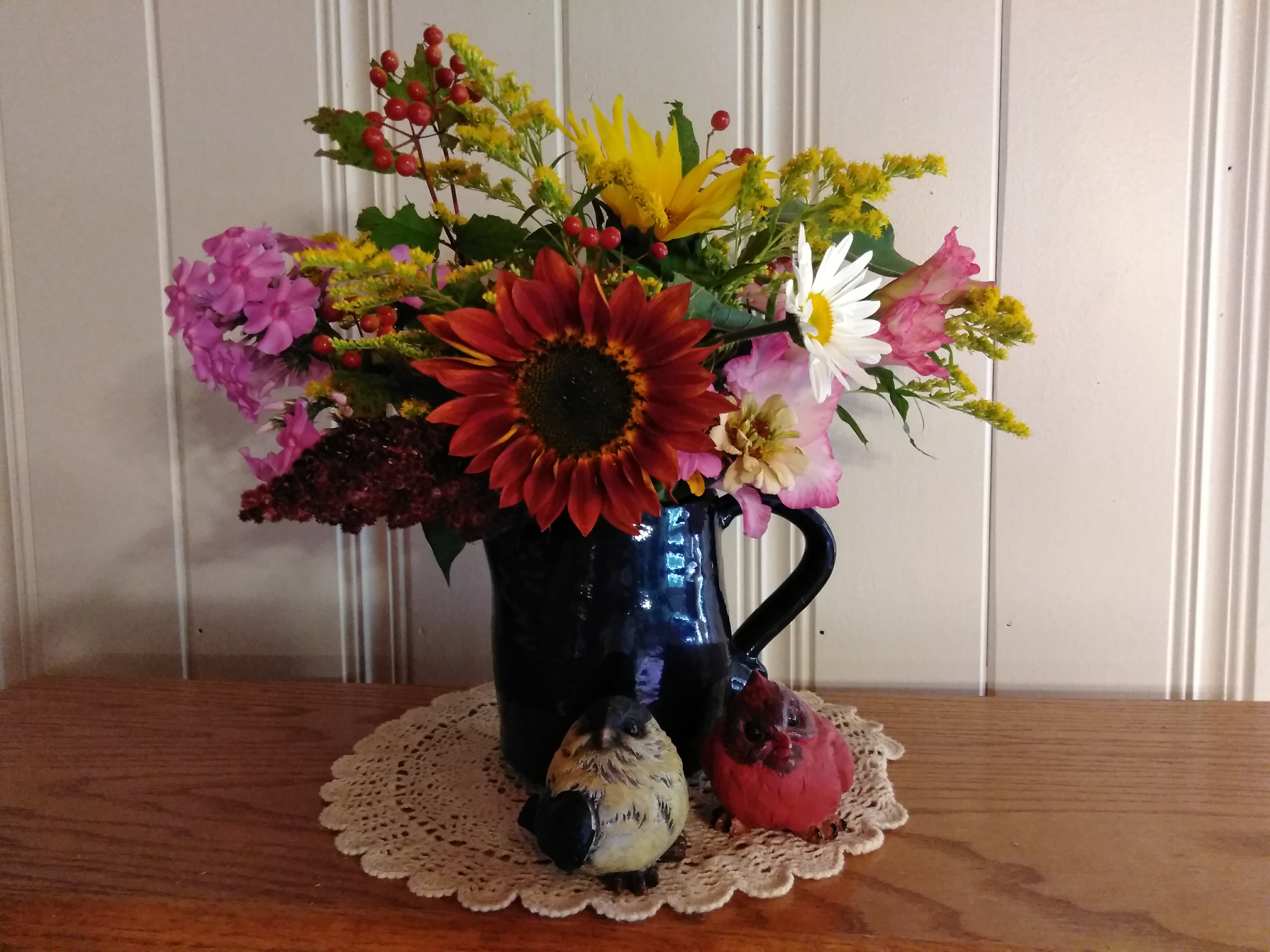 My thrift store shopping was particularly successful last Saturday. I’m loving that blue crock, and the flowers in it. If that isn’t a picture of summer and fall converging, I’m not sure what is. I also found a squeeze-all food strainer. Or whatever you call it. Apple sauce maker, tomato juice maker, you know, that thing. The price tag said 5 dollars but I think she gave us a discount. Brand new. Very happy thing because I wasn’t sure if I wanted to put the money out for one but I also don’t like borrowing. Everyone needs their own this time of year.