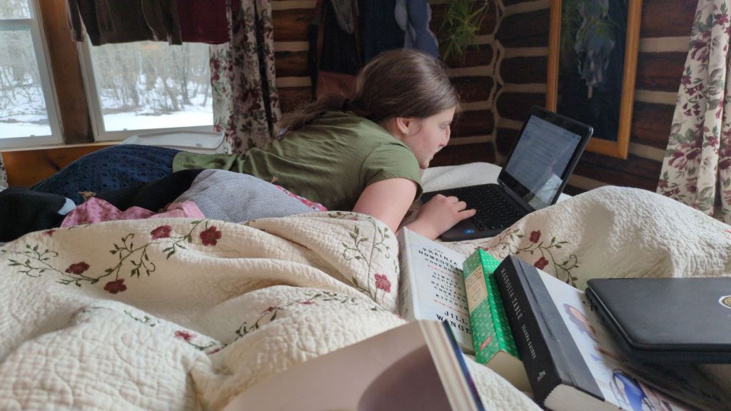 We look for community for our kids and hang onto it where we find it. Jube went to a youth event the other night and enjoyed it. Havilah is headed to nationals with Bible Quizzing. We talked about Birchwood School for the kids as Dru works there anyway. But my soul rebelled. Let me have my kids. They’re all growing up too fast. Let us have our school mornings in the sunshine on my bed. Why should I share them with strangers? They are mine. Dru says for the first time in our marriage I seem to be saying the homeschool tropes. Fine.