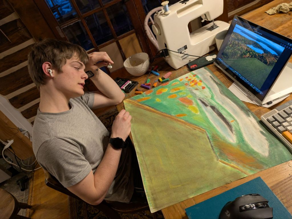 He hates pastels. He knows cuz he had to do this yesterday. I find the frustration of a male 16 year old to be slightly alarming. But he doesn’t throw things or use bad language so there’s that. He hates this art course but it’s fun to watch anyway. He is learning in spite of himself. This mundane is also one of my joys.